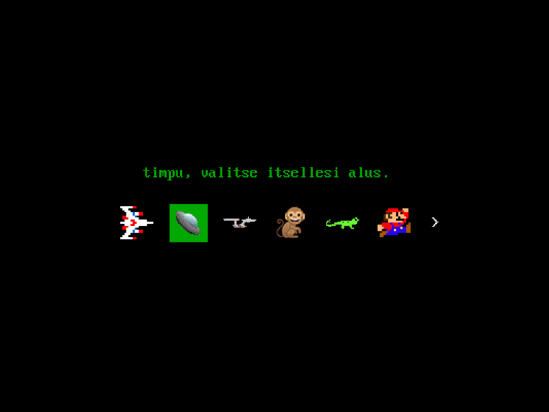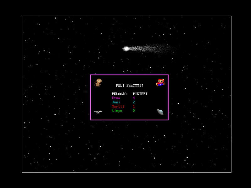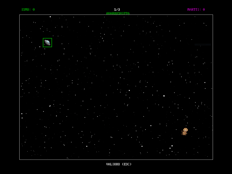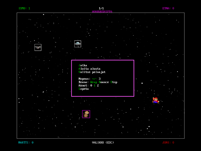 "Pelaajat valitsevat suunnan vuorotellen. Näin pelin unessa. Olin luonnostellut sen rengaskeinun renkaan sisälle. (Niin voi tehdä unessa.) Heräsin aamuyöllä ja kirjoitin idean varmuuden vuoksi heti ylös. Peli oli arcade-tyyppinen 80-luvun takaa-ajopeli. Se muistutti ehkä jonkin verran Tronia – paitsi että tosiaan – aluksia ohjattaisiin samoilla nuolinäppäimillä vuorotellen. Tällaisia ideoita voi keksiä vain unessa. Seuraavana päivänä kaivoin esiin 90-luvun basic-ohjelmointitaitoni sekä tuoreemman 64-bittisen qbasic-kääntäjän ja ryhdyin luonnostelemaan peliä. Oli helppoa olla uskollinen uneni valitsemalle tyylilajille, koska juuri siihen taitoni riittäisivät. Kiitos tiedostamattomalle mielelleni tasoituksesta! Valveen maailmassa minulle yritettiin ehdottaa alusten samanaikaista ohjaamista, mutta se olisi ollut liian ilmeistä. Halusin sitä paitsi tehdä nimenomaan uneni pelin. Sitä pelataan näin: Kahden pelaajan pelissä alukset yrittävät törmätä toisiinsa omalla vuorollaan, ennen kuin toinen ehtii ohjata omaa alustaan. Osumasta saa pisteen ja uusi kierros alkaa. Kun kierrokset on pelattu, eniten pisteitä kerännyt voittaa. Kolmen ja neljän pelaajan pelissä jokaisen kierroksen aluksi valitaan hippa, joka yrittää ottaa muita kiinni. Alukset, jotka eivät ole hippoja, voivat ohittaa toisensa törmäämättä. Alukset, jotka hippa saa kiinni, liittyvät takaa-ajajiin. Peli päättyy, kun jokainen pelaaja on hippa. Jokaisesta osumasta saa pisteen. Viimeisenä kiinni jäänyt saa palkinnoksi pisteitä pelaajien määrän verran – ja voittaa kierroksen. Yhden asian muutin: seinään saa osua. Se, mitä silloin tapahtuu, valitaan pelin asetuksista. Alus voi ilmestyä takaisin kentälle toisesta laidasta, kimmota takaisin tai pysähtyä. LatauksetWindows: Ruutukaappaukset