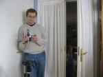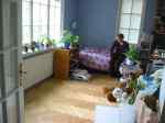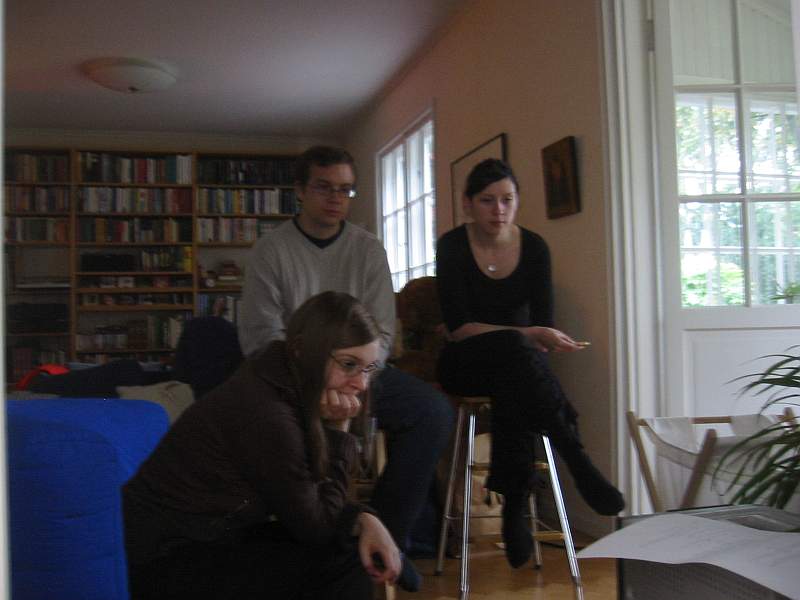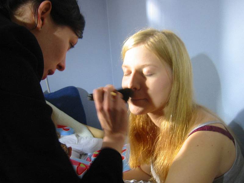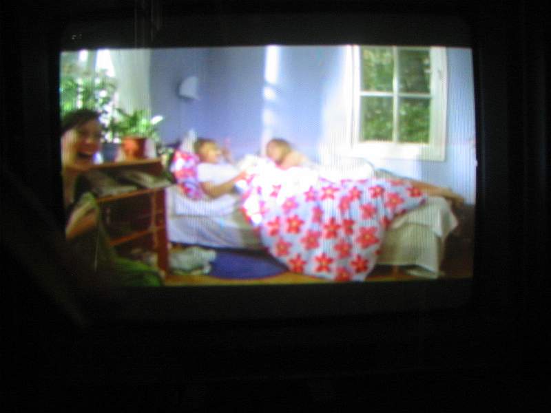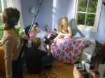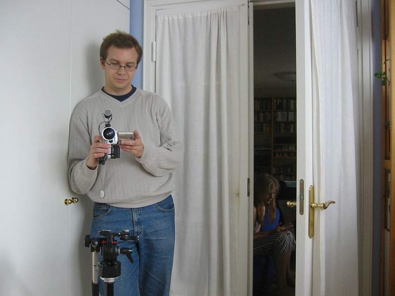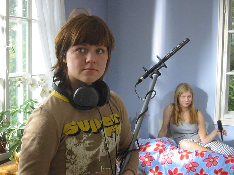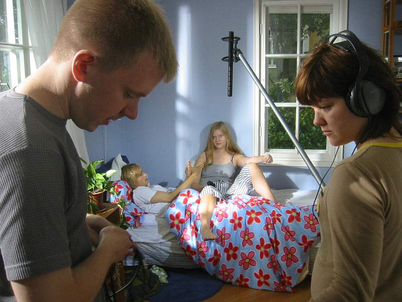 Sohva on juuri kannettu ulos. Lavastaja Anni miettii, mitä kannetaan seuraavaksi. Alina viimeistelee. Äänittäjänä debytoi Liisa. Mikrofonina debytoi ryhmämme uunituore mikrofoni, Sennheiser ME66/K6. Ohjaaja-kuvaaja istui lattialle, näyttelijät sängylle ja Liisa tarkkaili mikrofonin varjoa seinällä. Muu ryhmä tarkkaili tilannetta oven ja... ...monitorin takana. Niksu dokumentoi.