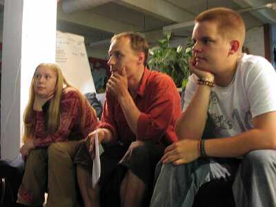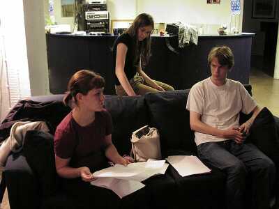 Elokuvan tekeminen alkoi puolen vuoden käsikirjoituksen ja valmistelun jälkeen koko tiimin ja näyttelijöiden yhteisellä palaverilla nuorten mediakeskuksessa. Tarkoitus oli valaa uskoa ja informaatiota tähän vastasyntyneeseen kollektiiviseen tajuntaan - yhteistuumin. Tässä kuvassa käsikirjoittaja-Anni himoitsee tuottaja-Liisan reppuun piilotettuja eväitä. Paperit ovat vain hämäystä.