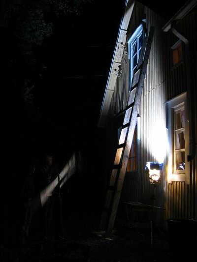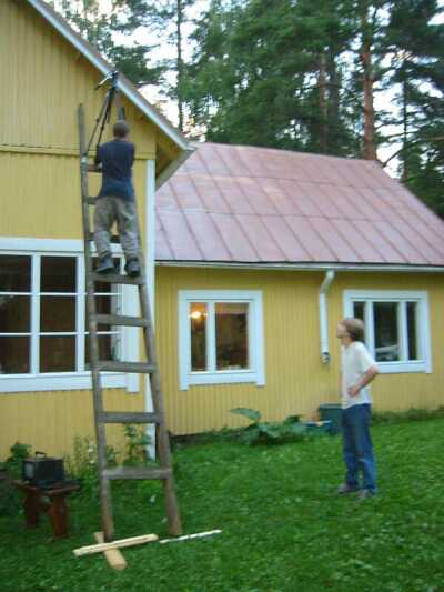 Tikkaiden luokse valmisteltiin kuva, jossa noustaan kraanalla kohti toista kerrosta. Yläkerran ikkunalla seisoi Olga ja odotti.