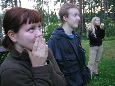Taustalla Liisa lämmittää Olgaa. Ohjaajaa ei kukaan lämmitä, joten ohjaaja on jo ihan sininen.