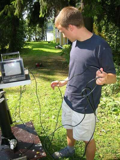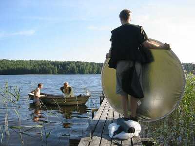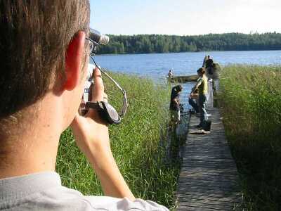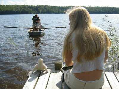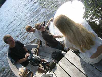 Etualalla sisko ja sen veli. Takana Ismo pohtii, olisiko kameralle pitänyt hankkia jonkunlainen vakuutus. Marcus vakuuttaa, että kaikki menee hyvin, "jos vain saat tämän veneen menemään edes hetken suoraan".
