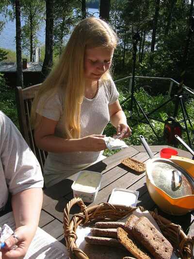 Leipä pitää miehen tiellä ja naisen laiturilla. Olgaa hymyilyttää, aiemmassa Rannalla-tuotannossa ruoan saaminen kun oli välillä vaihtelevaa. Kesän lämmössä ja metsän tuoksussa Liisan tiimille järjestämä catering maistui mannalta. Vasemmalla Jaanan vasen käsi.