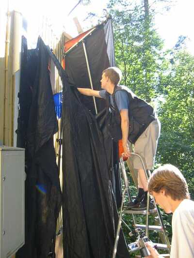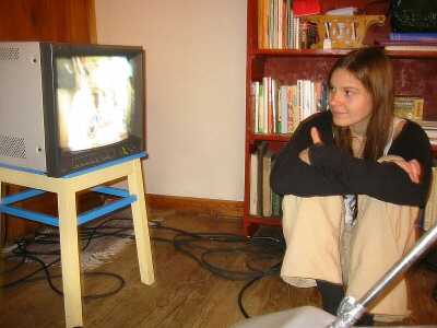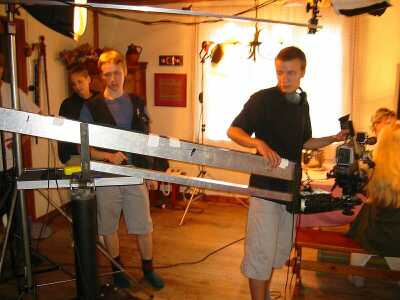Ensimmäisenä sisäkohtauksena tehtiin ruokailu. Kraanan käyttöä oli onneksi jo harjoiteltu - lamppujen, vanhojen huonekalujen ja koriste-esineiden keskellä se oli hyödyllinen taito. Kuvan yläreunassa kurkottaa Mikan rakentelema loisteputkivalaisin.