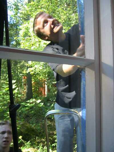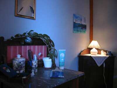Seinällä roikkuvat pikkutaulut tekivät kaikkensa heijastaakseen valoja. Niiden alle ujutettiinkin kaikenlaista pyykkipojista paperimyttyihin kääntämään heijastuksia pois.