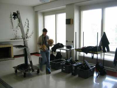 Kalusto varastoitiin kolmannen kerroksen aulaan, jonka seinälle oli kuivunut köynnös. Liisa noutaa kahta viljavalmisteista koriste-esinettä rekvisiitaksi kuvauspaikalle.