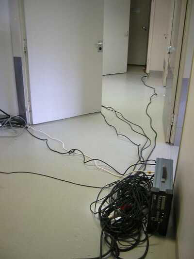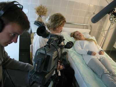 Viljavalmisteinen koriste-esine tuotiin tänne. Sairaalahuone lavastettiin tyhjään laboratoriotilaan. Sairaalasängyissä oli valinnanvaraa, joten valitsimme sellaisen, joka toimii sähköllä (huvin vuoksi). Tässä ei kuitenkaan leikitä: Marcus ja Late säätävät äänentasoja näyttelijöiden harjoitellessa.