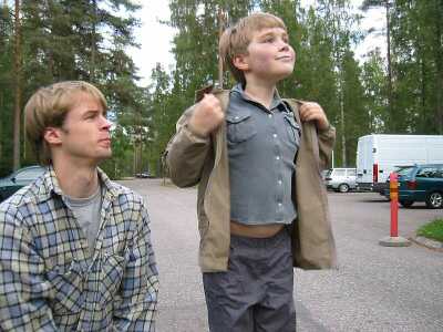 Välillä kuvattiin funkkisseinien ulkopuolella. Miikka Huuskonen esitti pientä tummaa miestä, jonka piti olla vakava. Ismo näyttää esimerkkiä.