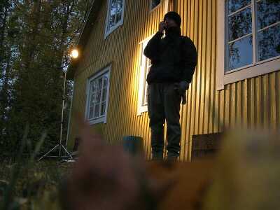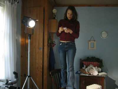Talvisia sisäkuvia kuvattiin myöhään syksyllä. Kesälläkin olisi voinut kuvata - ei olisi tarvinnut erikseen lämmittää taloa ja silti palella - mutta pimeää olisi saanut odottaa kuin jouluaattoa (ensin odotetaan vuosi ja sitten se on yhtäkkiä ohi). Tässä kuvassa Dana pudottelee valon eteen pumpulia lumihiutaleiksi. Jossain kuvan ulkopuolella Marcus katselee epäuskoisesti.