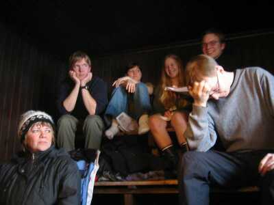 Saunan lauteilla lämmittelemässä. Kuvan ulkopuolella varmaankin säädetään valoja. Late odottaa innokkaana, että pääsisi jo äänittämään.