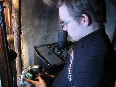 Saunan pukuhuoneessa kuvattavia kuvia varten lämmitettiin kiuas. Niksu kävi lisäämässä puita.