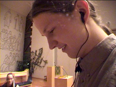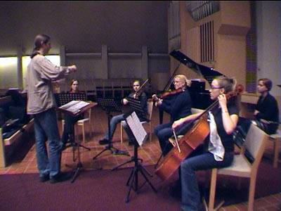 Suuria hetkiä amatöörielokuvan historiassa: kamariorkesteri soittamassa elokuvamusiikkia Vuosaaren kirkossa. Martti johti. Urkuja käytettiin myös elokuvan äänimaailmassa.